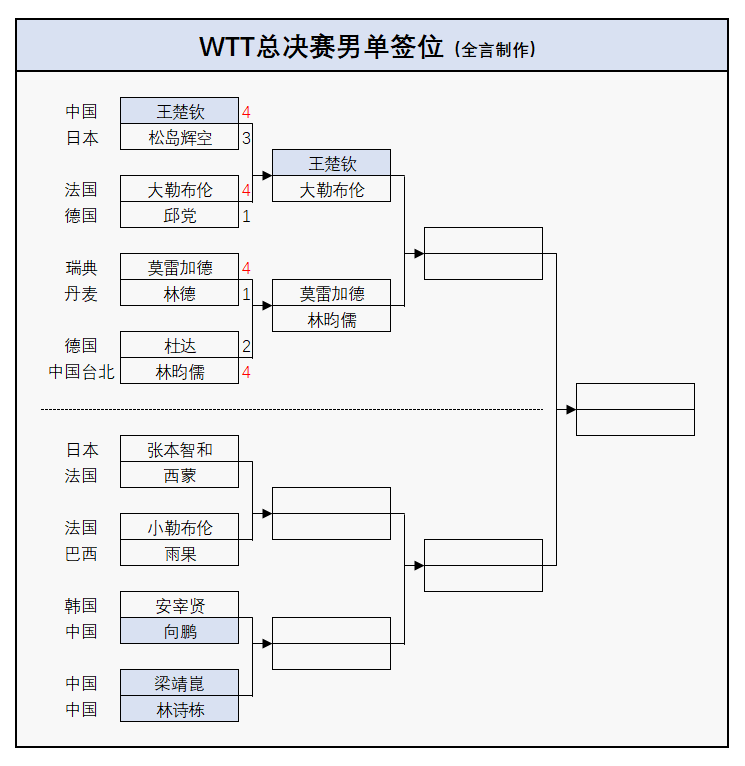 林昀儒4-2杜达(12-10、6-11、5-11、11-8、11-5、13-11);大勒布伦4-1邱党(8-11、11-7、11-9、12-10、11-8);王楚钦4-3松岛辉空(6-11、9-11、11-4、12-14、12-10、11-4、11-9);莫雷加德4-1林德(14-12、11-7、11-5、8-11、11-8)。