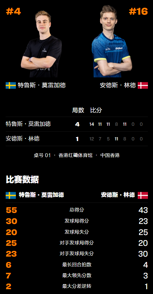 第三局莫雷加德很快便3-0超过声威如虹,林德则在场上显得折腰丧气于是叫出暂停颐养情状。从头参加比赛后,林德依旧找不到太多赢球的观念,效果赶快被拉开差距,最终被莫雷加德以11-5取胜,由此而连丢三局被逼入绝境。