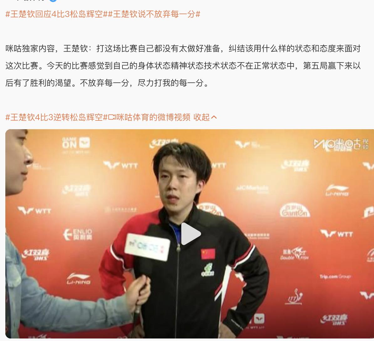 一言以蔽之,这场比赛王楚钦再度校服了我方,再度作念到球不落地,永不烧毁。我信服他这个竞技体育精神会感染着好多年青球员,也会让好多球迷荒谬感动。接下来大头将会赓续面对着挑战,下一场比赛将面对勒布伦。另外一方面,混双比赛也相似面对着好多的一些劲敌,但愿他赓续再接再厉,打出好的清晰,向两个技俩标冠军发起冲锋。同期也但愿他不要给我方制造太多的压力和职守。