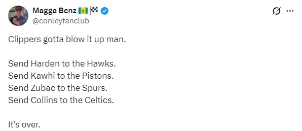 好意思球迷则放纵吐槽:看到快船关节时刻的现实力,保罗正在暗处偷笑;快船重建吧,哈登去老鹰,小卡去活塞,祖巴茨去马刺,科林斯去凯尔特东说念主。