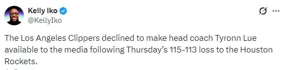 据火箭队记Kelly Iko报说念,快船休止让主涵养泰伦·卢禁受媒体采访;据统计,本赛季于今,快船打到关节时刻的比赛2胜10负,与鹈鹕比肩定约最差。