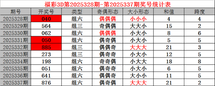 上期转头:福利彩票3D第2025337期开奖后果876。奖号:偶奇偶、大大大,和值21,跨度2。