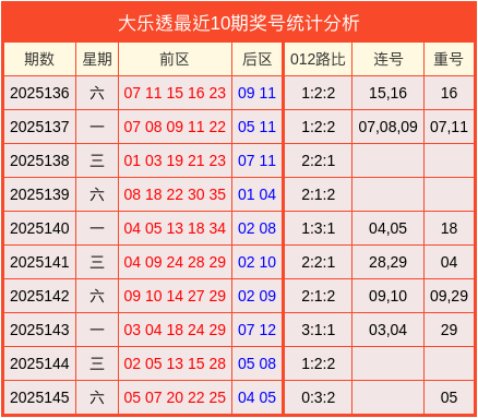 上期回来:大乐透2025145期开出奖号:前区05、07、20、22、25,后区04、05。