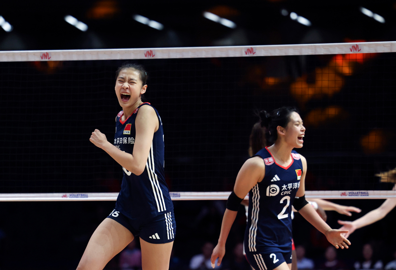 新华社像片,北京,2025年6月7日\n 6月7日,中国队球员王奥芊(左)在比赛中庆祝。\n 当日,在北京举行的2025年全国女排联赛(中国北京站)小组赛中,中国队3比0慑服法国队。\n 新华社记者 雒圆 摄