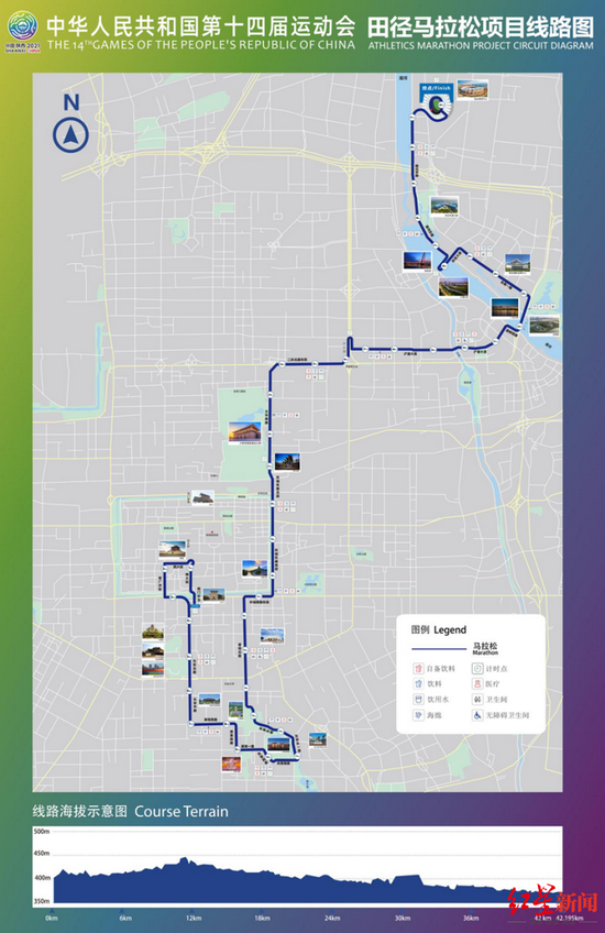 十四运马拉松的赛说念以雍容大气的古城墙永宁门为着手,穿越整座城市,最终抵达西安奥体中心田径场。