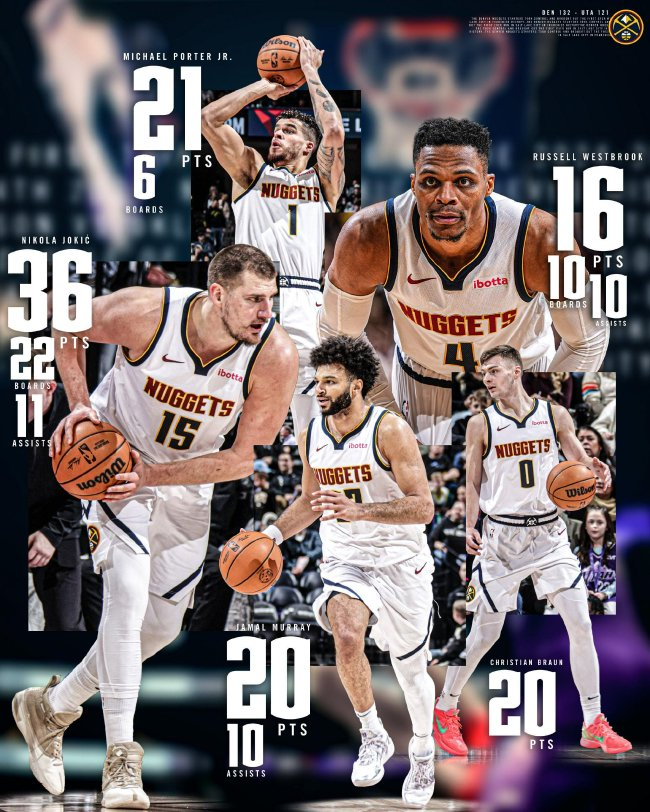 掘金(18-13):约基奇36分22篮板11助攻4抢断、威少16分10篮板10助攻4抢断、小波特21分6篮板、穆雷20分4篮板10助攻、布劳恩20分3抢断、沃特森13分4篮板