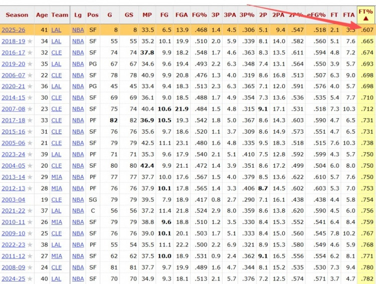 詹姆斯生活罚球掷中率一览