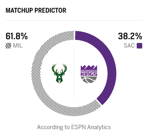 ESPN瞻望明日比赛:雄鹿胜率61.8%,国王胜率38.2%