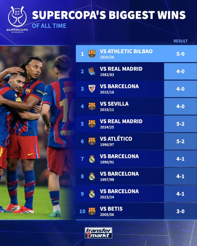 1月8日讯 西超杯半决赛,巴萨5-0大捷毕尔巴鄂竞技。德国转会商场统计了西超杯历史最大比分到手,比肩出榜单,巴萨5-0毕巴居首。