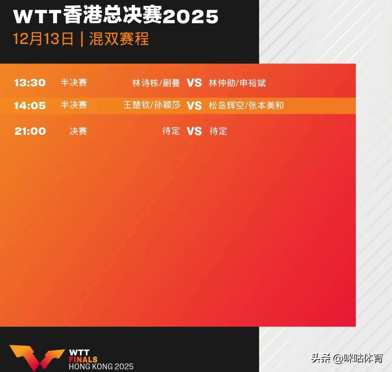 • 13:30 混双半决赛:林诗栋/蒯曼 vs 林钟勋/申裕斌,中韩组合强强对话,争夺决赛限额;
