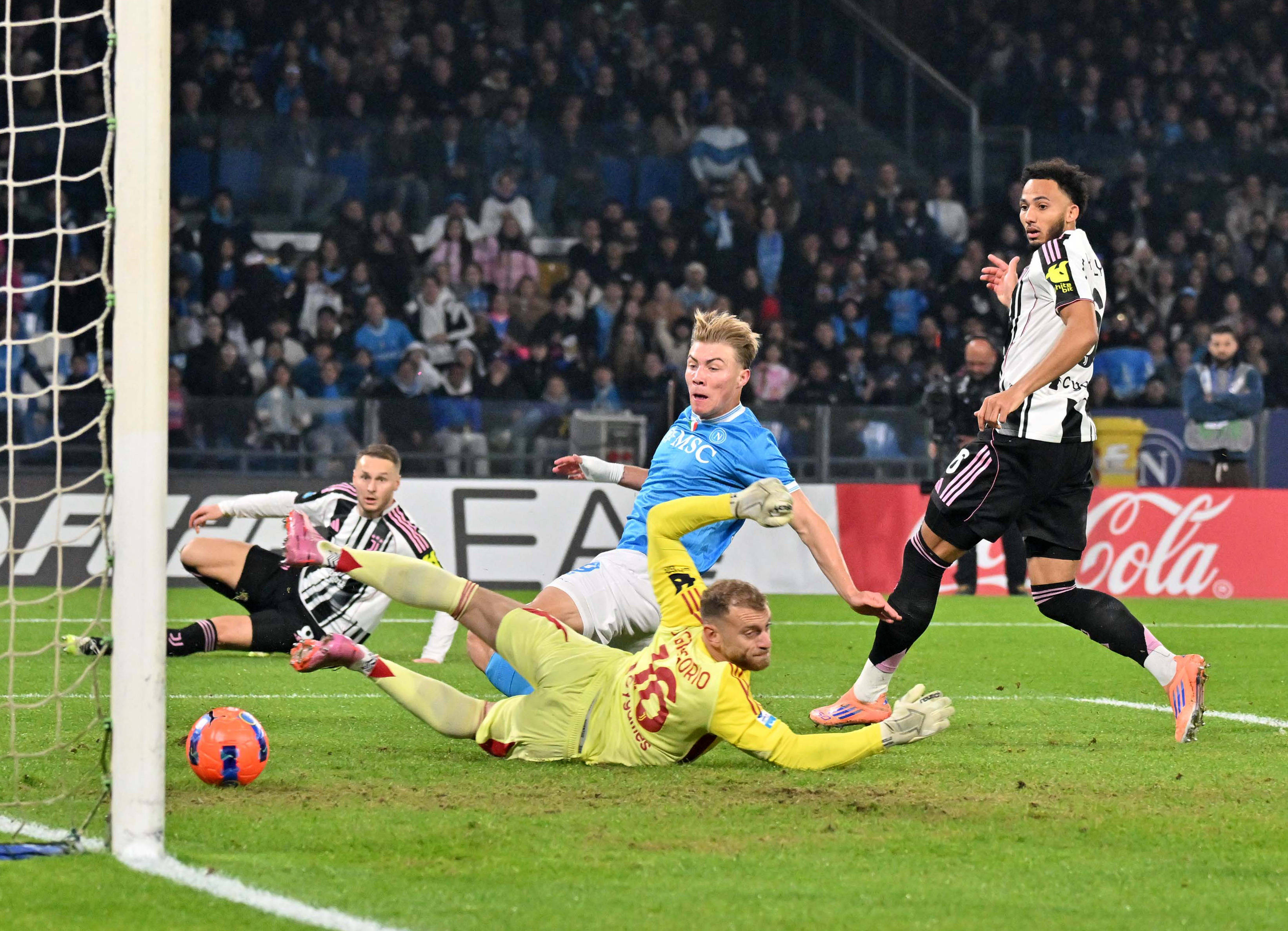 那不勒斯开场不久就有所斩获。第七分钟,霍伊伦接队友内雷斯的横传,近距离包抄破门。尔后两队你来我往,上半时接近尾声时,尤文球员凯利将绝佳契机球踢飞,而主队麦克托米纳的头球也被立柱终止。