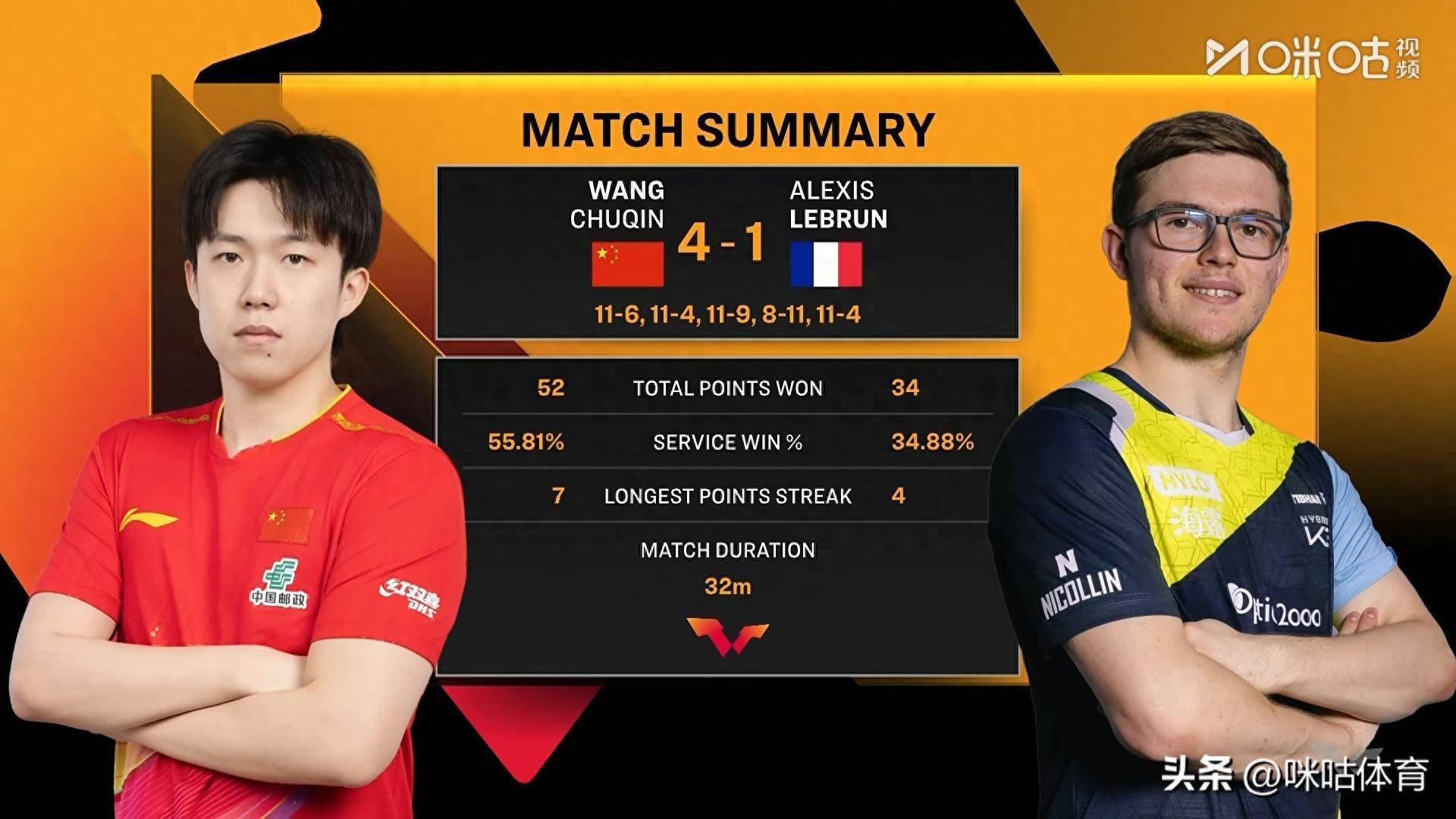 在赛后采访中王楚钦暗意:“跟A-勒布伦再度交手,他畸形有创造力,紧迫质料畸形高,濒临比赛我方心态比拟好,莫得念念输或赢,在赛场上进展我方的水平,半决赛濒临林昀儒与莫雷加德的胜者,每一场比赛充满了各式可能,每一次齐是新的运行,但愿我方有好的运行。 ”