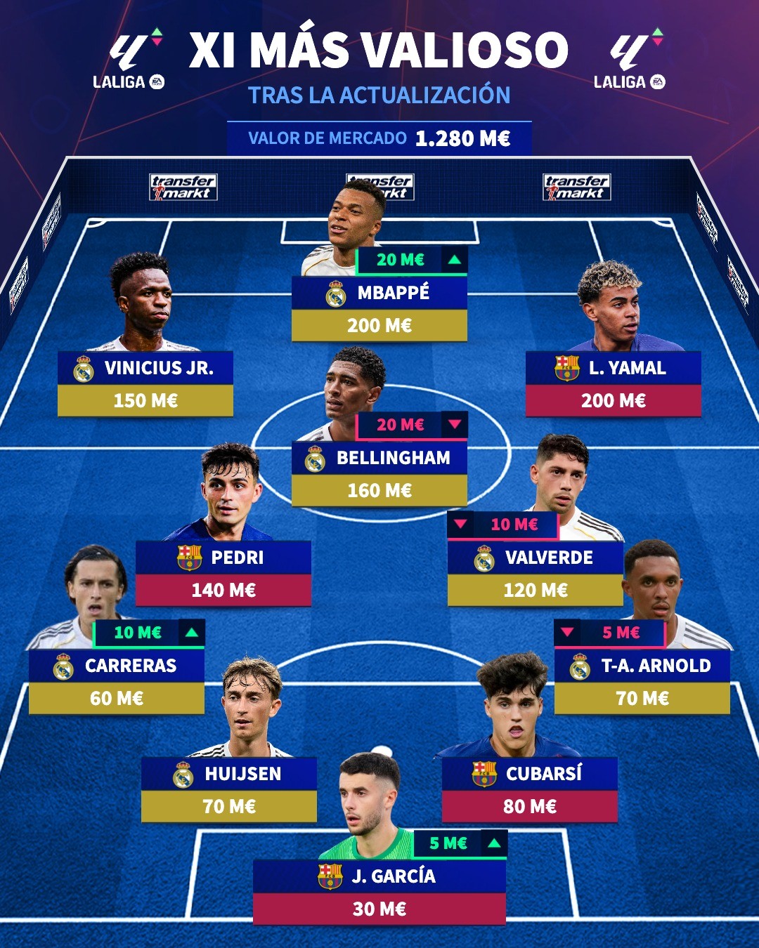 前场:维尼修斯(皇马,1.5亿欧)、姆巴佩(皇马,2亿欧)、亚马尔(巴萨,2亿欧)