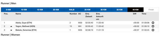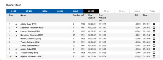 40公里,阿多拉再次加快开脱了叶贡,他用时1小时59分08秒达到计时点,3年前,基普乔格用了1小时55分29秒。