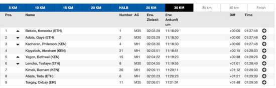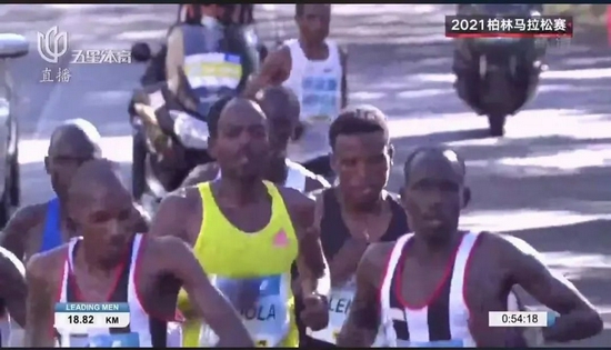 半程用时1小时01分06秒。过了半程后,贝克勒莫得再掉速,而是紧追第一集团。