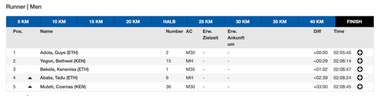 阿多拉的首马是在2017年的柏林马拉松,那时那场比赛他差点跑赢了基普乔格,最终逾期敌手14秒取得亚军,他那时跑出2小时03分46秒的收货,超过贝克勒的2:05:04,成为历史上首马跑的最快的东谈主,2017年柏林马拉松的收货一直皆是他的PB。