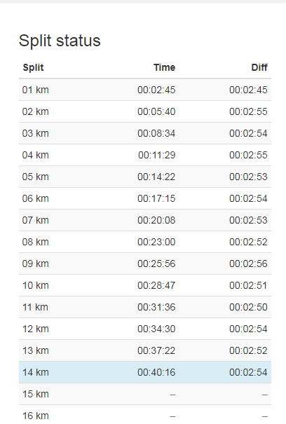 第一个5公里用时14分22秒,平均2分53秒的配速,刚开跑速率就拉的很快。