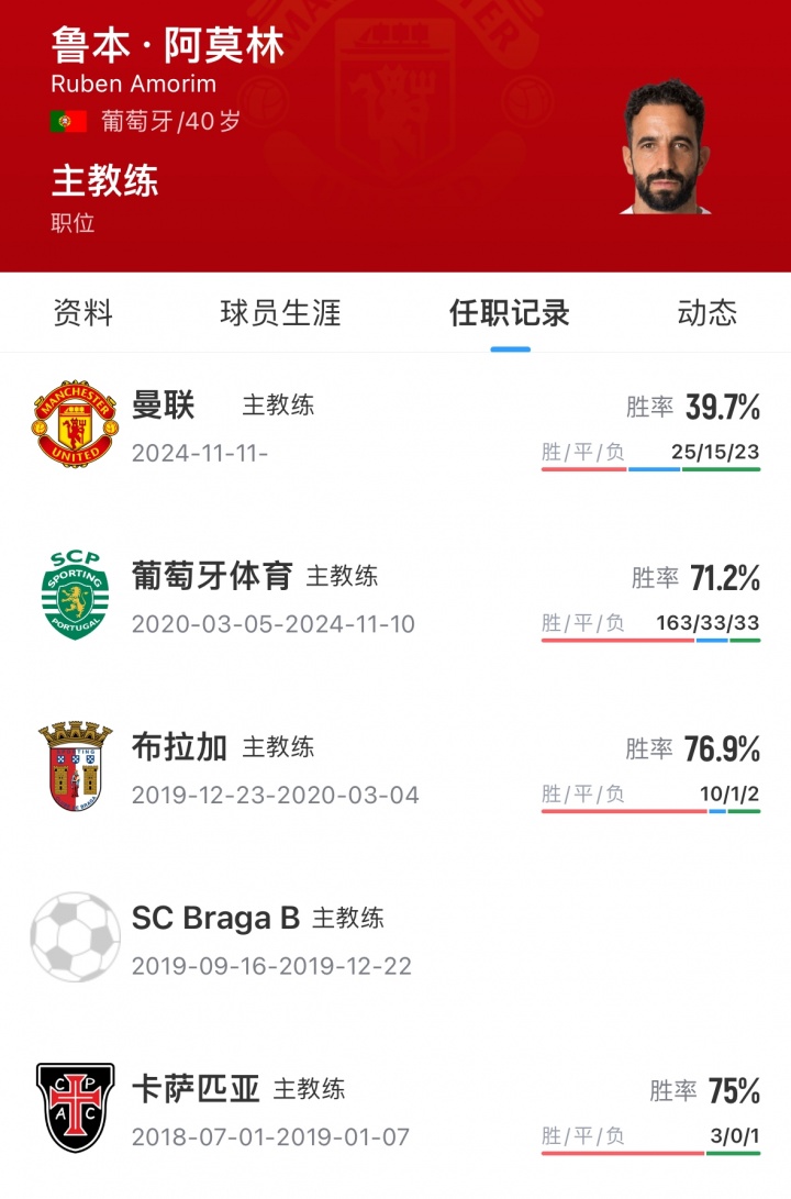 2024年11月,阿莫林出任曼联主帅,带队得到25胜15平23负,带队一年胜率不及40%。本赛季曼联咫尺排行英超第6。