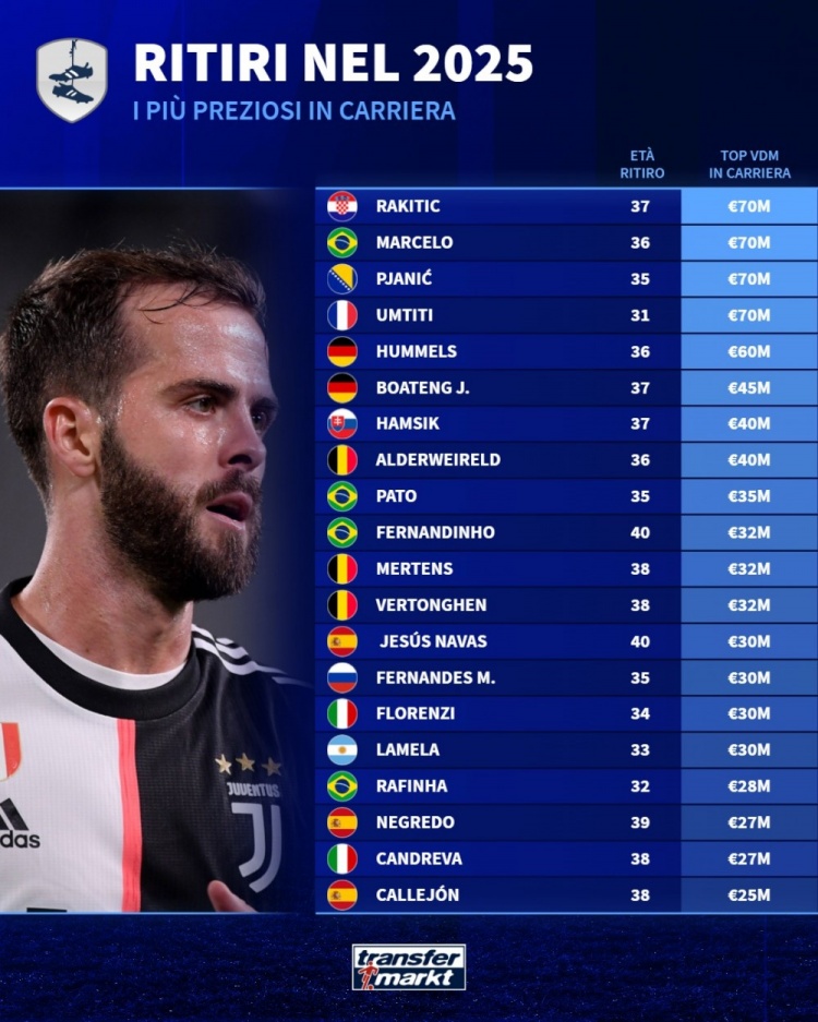 1月3日讯 德国转会市集统计了2025年退役球员的历史最高身价,并排出榜单,拉基蒂奇、马塞洛、皮亚尼奇、乌姆蒂蒂7000万欧居首。