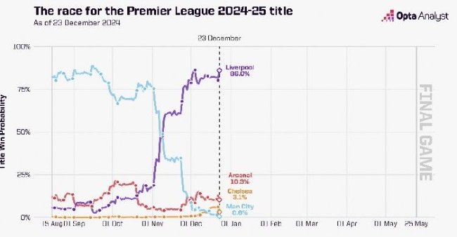 OPTA通过大数据忖度清楚,赤军本赛季夺冠但愿很大。而卫冕冠军曼城从赛季初的接近80%夺冠概率仍是真的归零。
