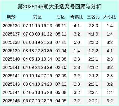 当期前区号码大小比为3:2,三区比为2:2:1,奇偶比为3:2。
