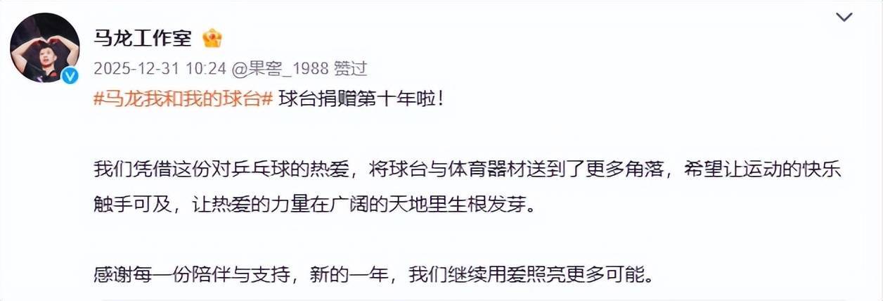 如今,距离全运会结果仅1个月,马龙的责任室公布了该公益项诡计发扬。